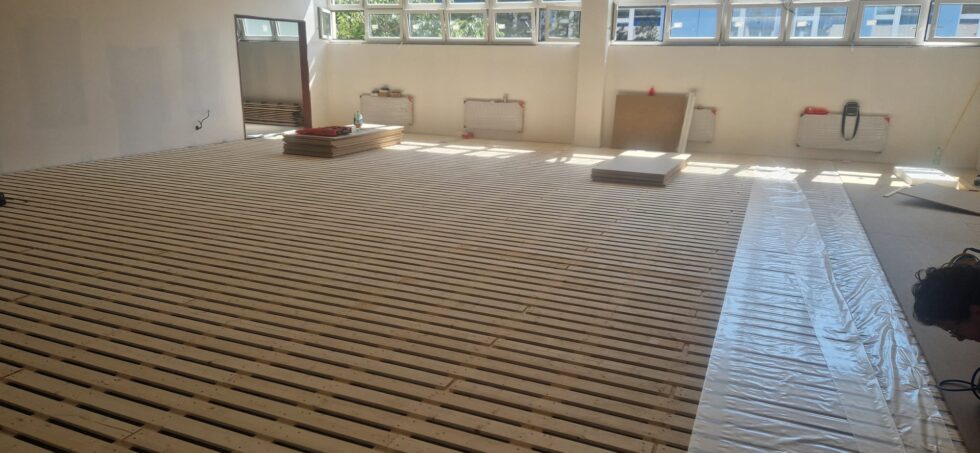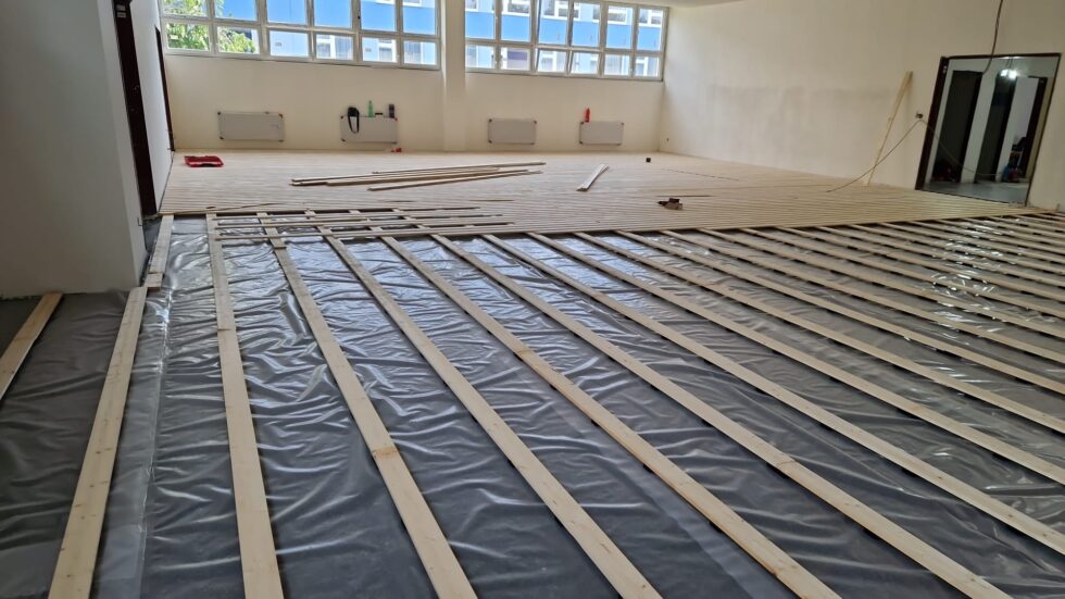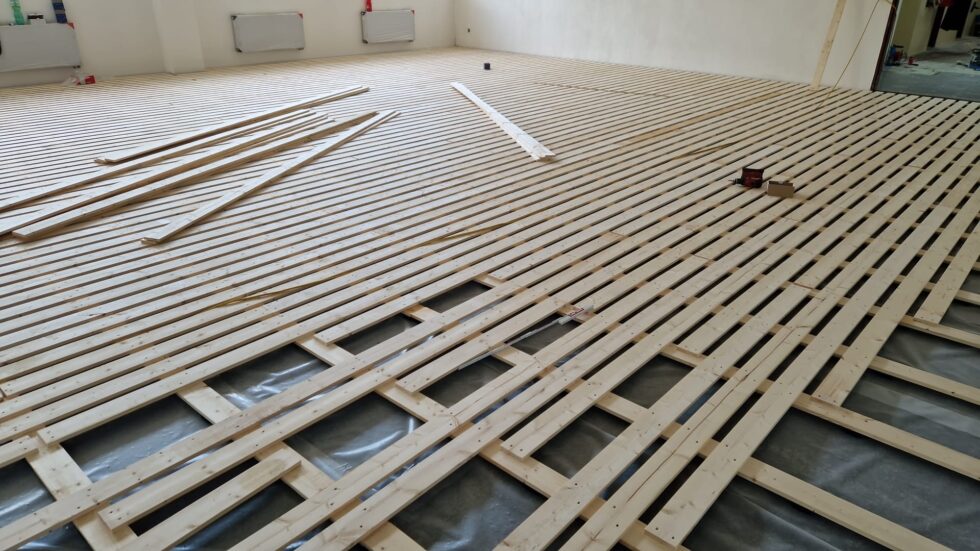 Příprava roštu z dřevěných desek pod následně instalovanou sportovní PVC podlahu v tělocvičně.