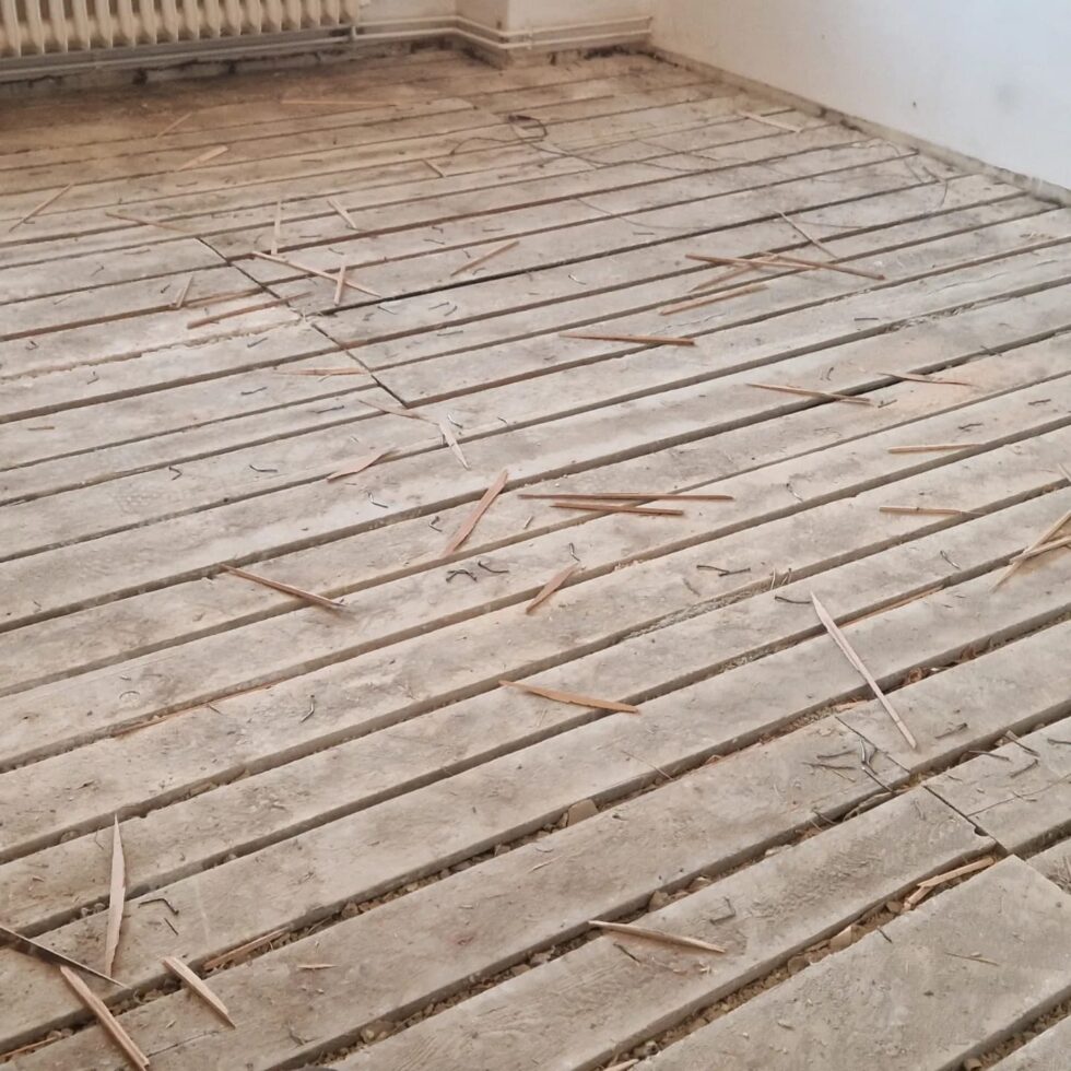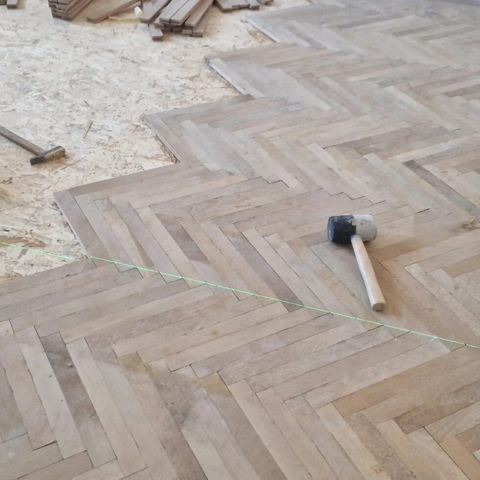 Rozložení starých dřevěných parket a jejich zpětná instalace na vyrovnaný podkad